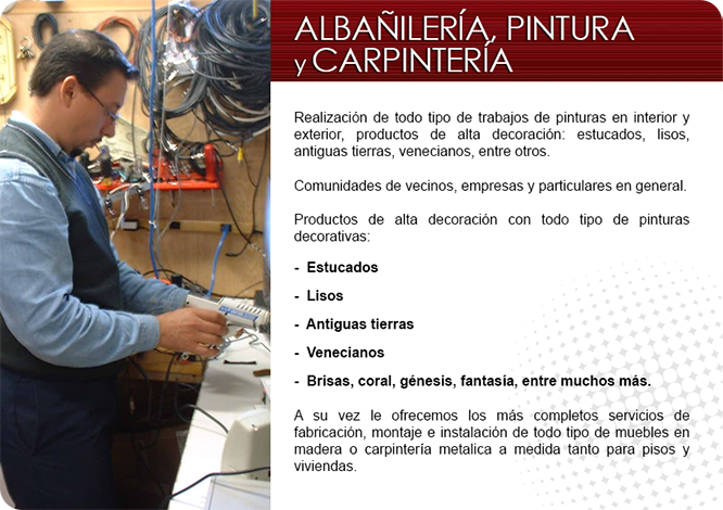 Realización de todo tipo de trabajos de pinturas en interior y exterior, productos de alta decoración: estucados, lisos, antiguas tierras, venecianos, entre otros. Así como realización de trabajos de carpintería en madera y metal.